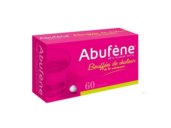 Abufène 400 mg – 60 comprimés est un médicament sans ordonnance indiqué pour soulager les bouffées de chaleur liées à la ménopause, grâce à son principe actif bêta-alanine.