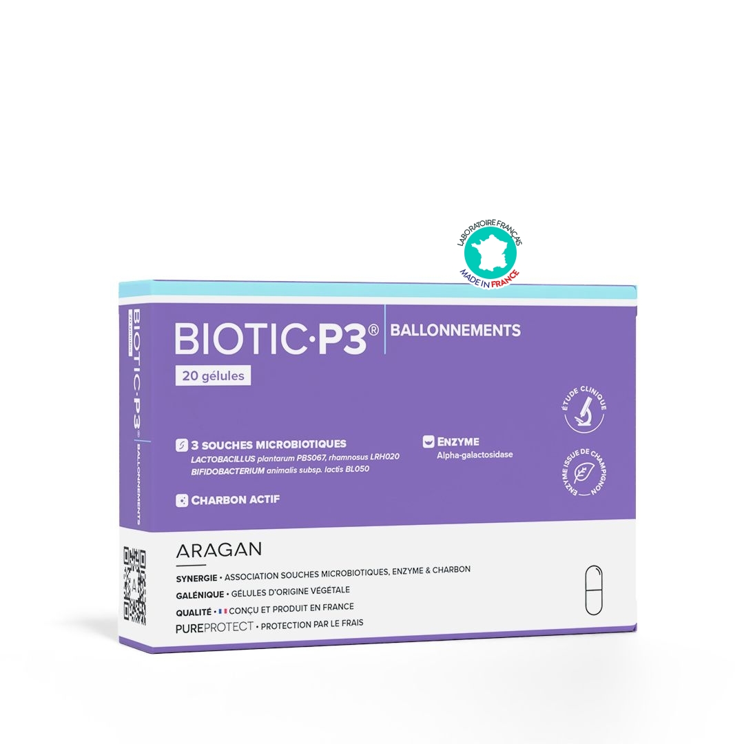 Les ballonnements et les gaz digestifs sont souvent liés à un déséquilibre de la flore intestinale, une digestion incomplète ou une fermentation excessive. Biotic P3® Ballonnements Aragan agit sur plusieurs leviers complémentaires :