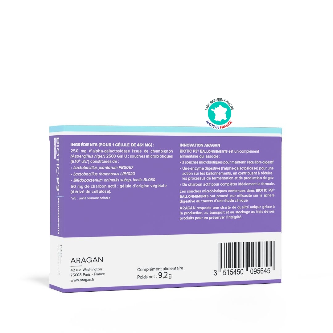 Biotic P3® Ballonnements Aragan est un complément alimentaire formulé pour réduire les ballonnements et réguler les gaz digestifs. Il associe 3 souches microbiotiques cliniquement étudiées dosées à 6 milliards d’UFC, une enzyme digestive et du charbon actif, reconnu pour son action absorbante sur les gaz.