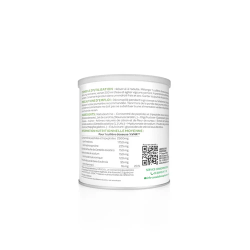 Poudre nutri-cosmétique 6-en-1 formulée pour stimuler la production naturelle de collagène, améliorer la fermeté de la peau, soutenir l’énergie, renforcer les défenses et contribuer au bon fonctionnement articulaire et musculaire.