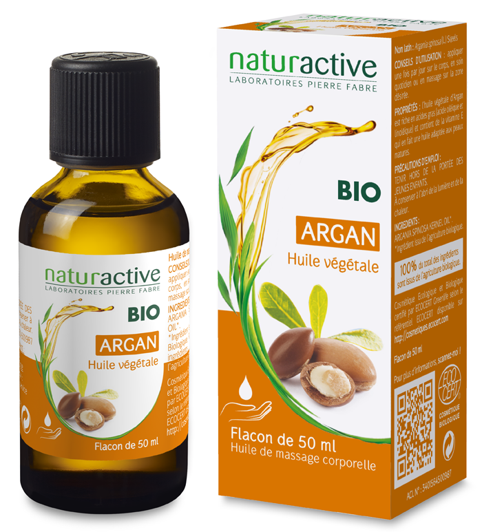 Naturactive huile végétale bio argan est composée d'argania spinosa kernel oil. Les ingrédients sont issus de l'agriculture biologique cosmétique ecologique et biologique certifié par Ecocert greenlife.