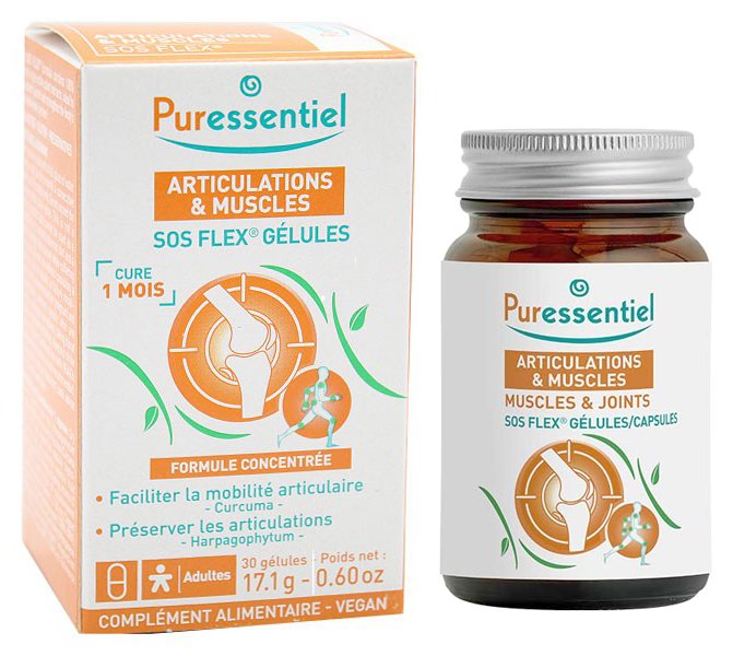 Le SOS Flex Gélules Formule Concentrée de Puressentiel. Ce complément alimentaire est formulé à base d'extraits secs de racine d'Harpagophytum (Harpagophytum procumbens), de rhizome de Curcuma (Curcuma longa L.), de fruits d’Acérola (Malpighia glabra) et de sommités fleuries de Reine des prés (Filipendula ulmaria (L.) Maxim. L.).