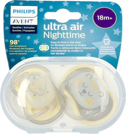 Informations sur Philips Avent Sucette Ultra Air nuit orthodontique 18 mois et plus — lot de 2 sucettes phosphorescentes silicone