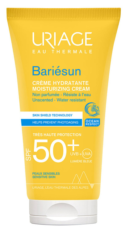 La Crème Hydratante Non Parfumée SPF50+ Bariésun d'Uriage est hypoallergénique, photostable, sans octocrylène et sans paraben.Cette crème a aussi un complexe anti-UV qui associe des filtres solaires Haute Tolérance pour convenir à la peau sensible.