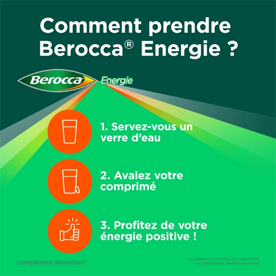 Berocca Energie est un complément alimentaire à utiliser en complément d’une alimentation variée et équilibrée, et d’un mode de vie sain.