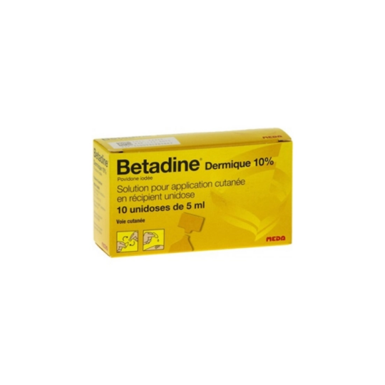 Bétadine Dermique – 10 unidoses est une solution antiseptique iodée sans alcool, utilisée pour désinfecter les plaies, brûlures superficielles et petites coupures.