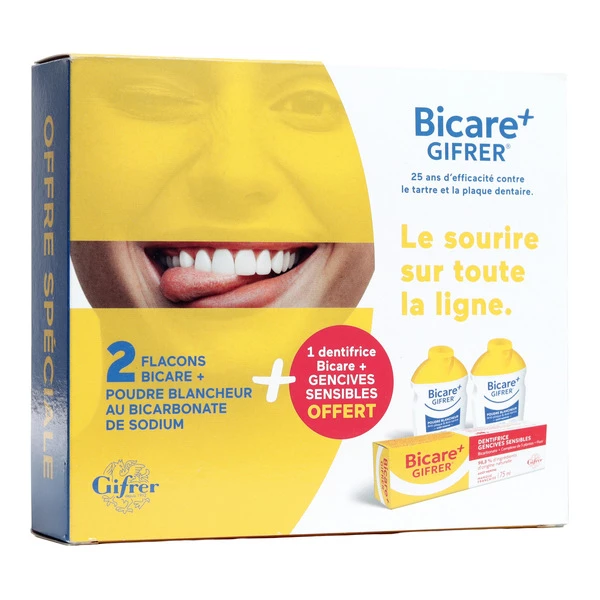 Coffret Gifrer associant 2 poudres Bicare Plus blancheur pour éliminer les taches dentaires et raviver l’éclat du sourire, avec 1 dentifrice gencives sensibles OFFERT pour un soin complet alliant efficacité blancheur et confort gingival.