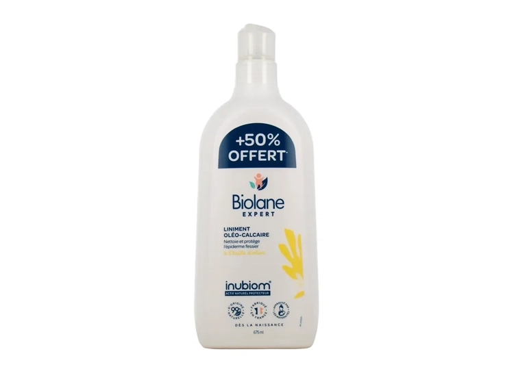 Liniment oléo-calcaire Biolane 675 ml pour nettoyer et protéger efficacement la zone du siège des bébés. Sa formule 99 % naturelle crée un film protecteur qui préserve la peau délicate et limite les irritations liées au port des couches.