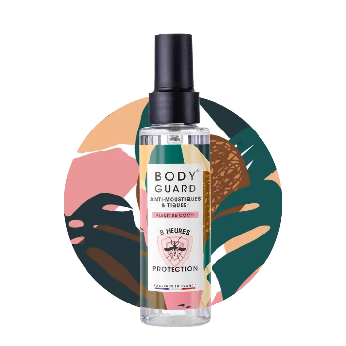 Le Bodyguard Anti-moustiques & Tiques Fleur de Coco est un répulsif haute performance offrant une protection de 8 heures contre les moustiques, y compris le moustique tigre, et les tiques. Alliant sécurité et plaisir sensoriel, sa formule biodégradable convient à toute la famille dès 12 mois, aux femmes enceintes et aux seniors, tout en enveloppant la peau d'un parfum estival aux notes de vanille et de jasmin.