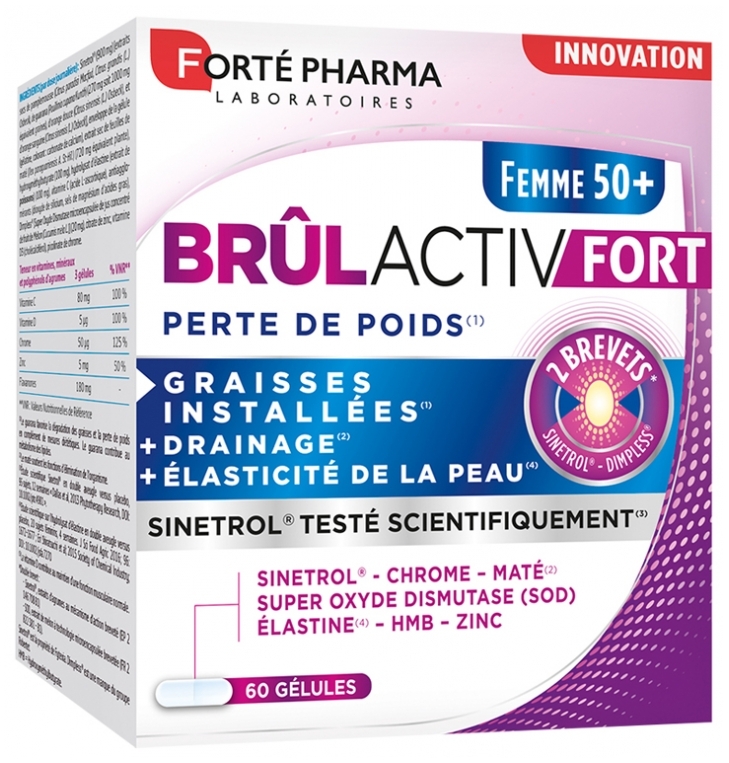 Femme 50+ Perte de Poids Brulactiv Fort de Forté Pharma cible les graisses installées pour réduire le poids. Sa formule contient un complexe Sinetrol à base de polyphénols d'agrumes (flavanones) et de guarana pour éliminer la graisse. Cet ingrédient est associé à du Dimpless, de la Super Oxyde Dismutase issu du melon et du chrome pour compléter l'action amincissante de ce complément alimentaire. Il contient également de la vitamine C et de l'élastine pour préserver la souplesse de la peau.Ingrédients et composition