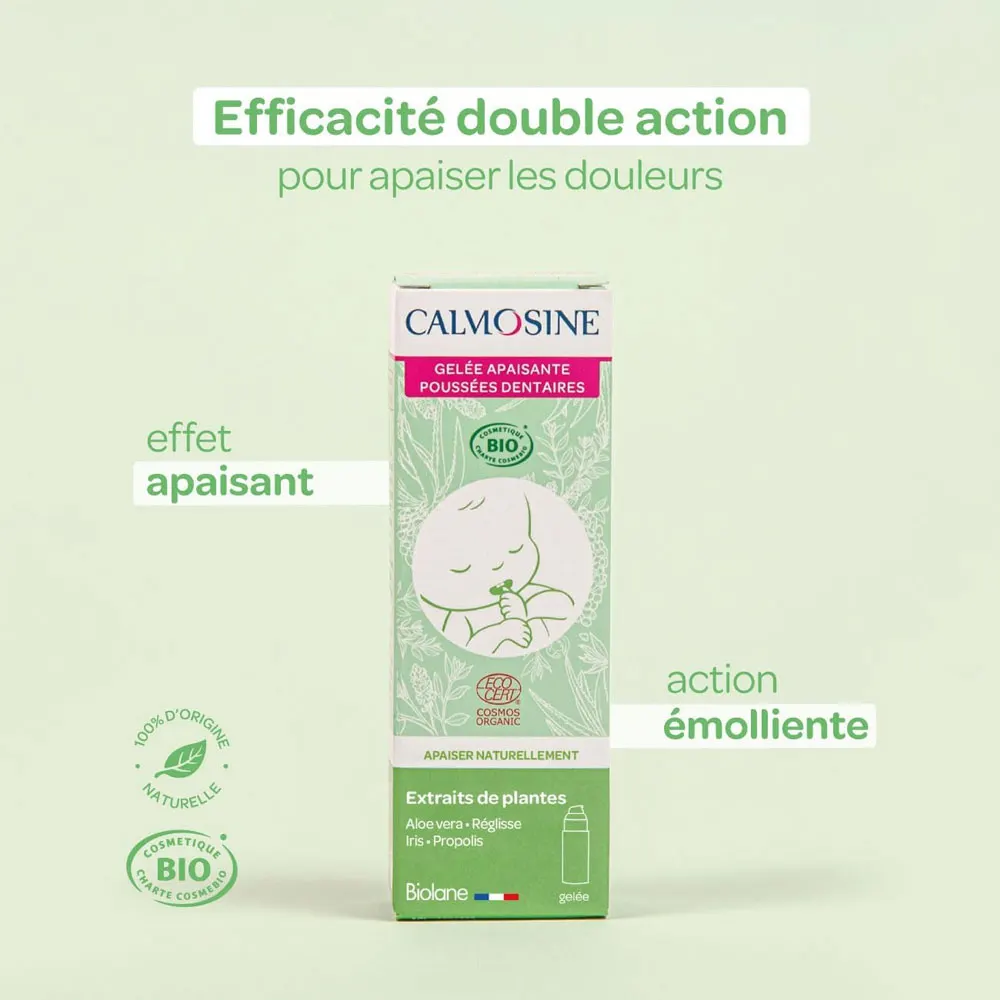 La gelée Calmosine apaisante poussées dentaires est spécialement formulée pour calmer les gencives irritées de bébé lors de l’apparition des premières dents. Elle combine des actifs biologiques naturels — aloé vera, réglisse, iris et propolis — pour apporter une action apaisante rapide et émolliente. Ce gel facilite la sortie des dents tout en respectant la sensibilité de la muqueuse gingivale.