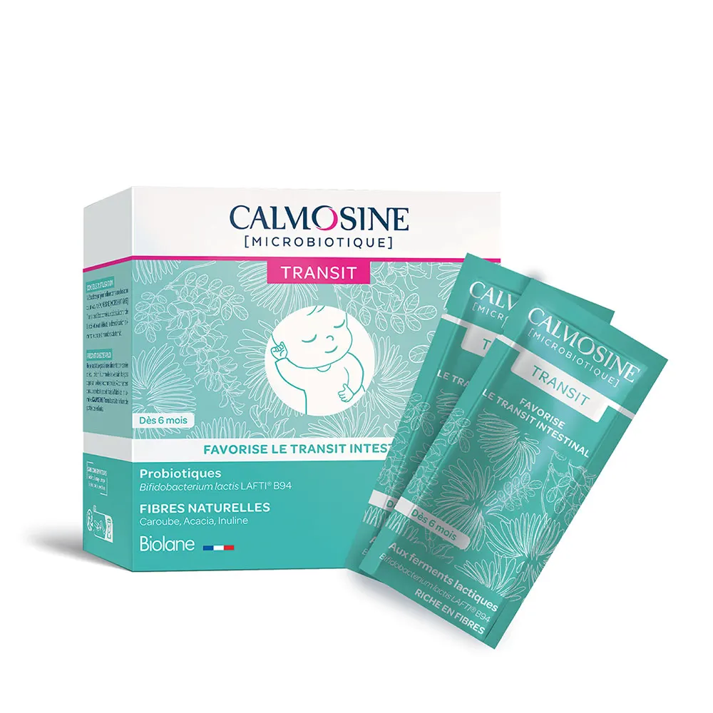 Calmosine Microbiotique Transit agit pour relancer le transit intestinal chez le bébé avec une formule naturelle et respectueuse. Il combine des fibres végétales (gomme d’acacia, inuline, caroube, tamarin) qui stimulent l’effet mécanique sur l’intestin, et la souche probiotique Bifidobacterium lactis LAFTI® B94 qui aide à maintenir un équilibre intestinal durable. Ce complément soutient à la fois la motricité intestinale et la flore intestinale saine.