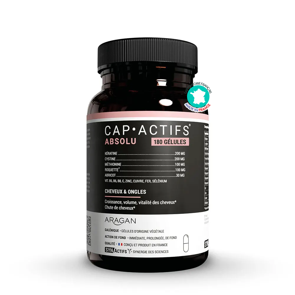 CapActifs Absolu Aragan est un complément alimentaire expert dédié à la croissance, à la vitalité et au volume des cheveux, ainsi qu’au renforcement des ongles. Sa formule complète associe acides aminés, plantes, vitamines et minéraux pour agir au cœur de la fibre capillaire.