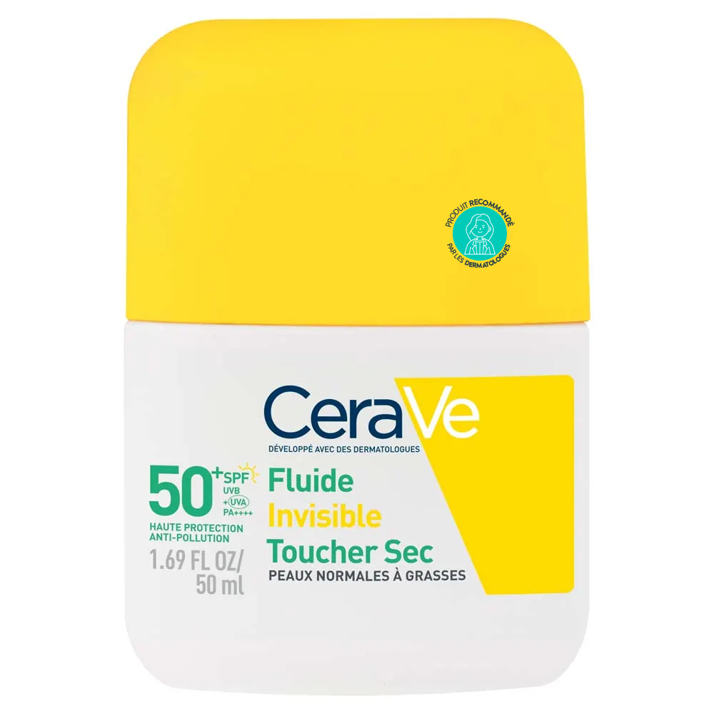 Le fluide invisible toucher sec CeraVe SPF50+ est un soin solaire visage formulé avec des dermatologues, alliant protection très haute SPF50+, effet matifiant 12h et renforcement de la barrière cutanée grâce aux 3 céramides essentiels et à la niacinamide. Sans parfum, sans alcool et non comédogène, il convient aux peaux normales à grasses, même sensibles, pour un fini invisible et un confort anti-brillance optimal au quotidien.