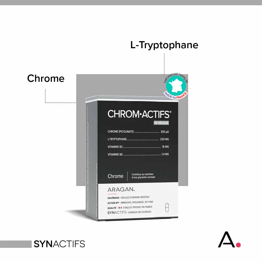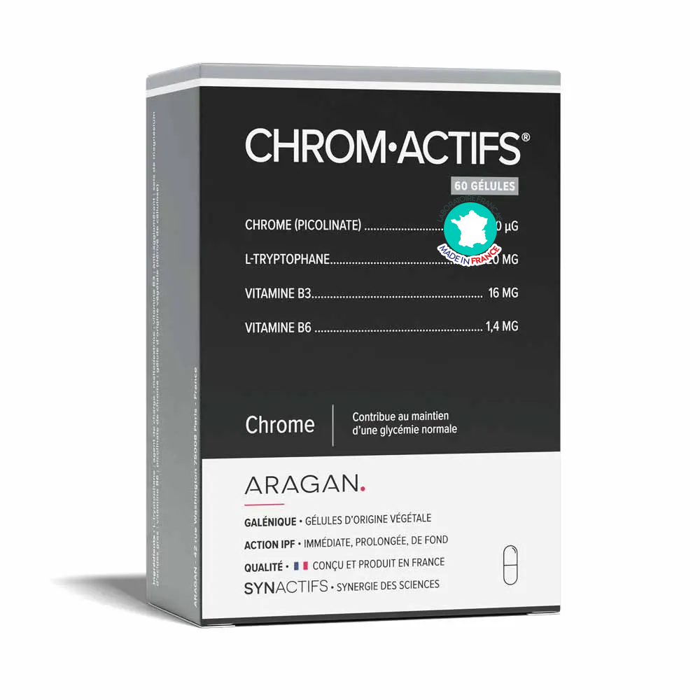 ChromActifs Aragan est un complément alimentaire formulé pour contribuer au maintien d’une glycémie normale, soutenir le métabolisme énergétique et aider au contrôle des pulsions alimentaires. Sa synergie associe chrome picolinate, L-tryptophane et vitamines B.