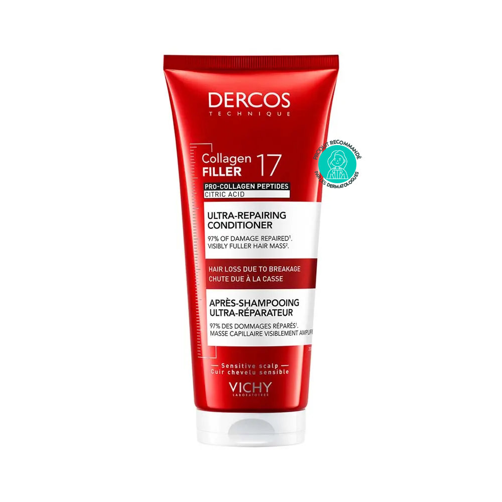 Le Dercos Collagen Filler 17 Après-Shampooing est conçu pour renforcer les cheveux affaiblis par les agressions quotidiennes : chaleur, colorations, pollution ou stress.