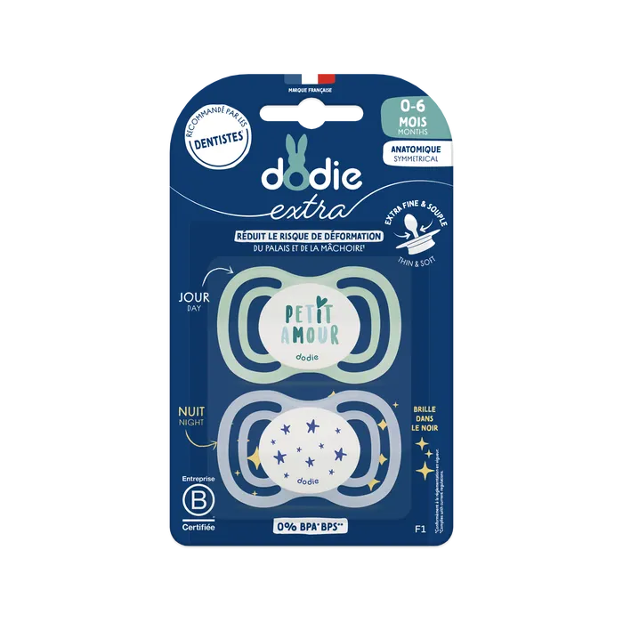- Lot de 2 sucettes anatomiques Extra Dodie 0-6 mois pour puériculture.