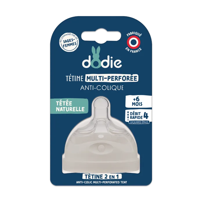 - Tétine multi-perforée anti-colique Dodie débit 4 en silicone pour biberons.