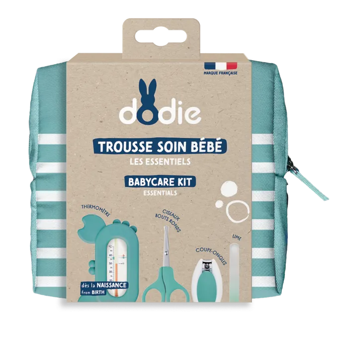 - Trousse soin bébé Les essentiels Dodie avec accessoires indispensables pour hygiène quotidienne.