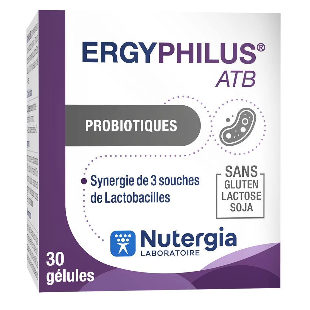 Ergyphilus ATB est un complément alimentaire développé par le laboratoire Nutergia, expert du microbiote. Il a été conçu pour accompagner les traitements antibiotiques, période durant laquelle la flore intestinale est particulièrement fragilisée.
