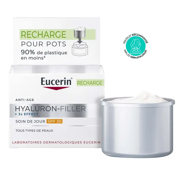 La recharge soin de jour Eucerin Hyaluron-Filler + 3x Effect SPF30 est un soin anti-âge quotidien formulé avec de l'acide hyaluronique, de la glycine saponine et un SPF30 protecteur pour combler les rides profondes, hydrater intensément et stimuler la production naturelle de collagène. Son format recharge réduit de 90% l'utilisation de plastique par rapport au pot classique, pour une beauté efficace et éco-responsable.