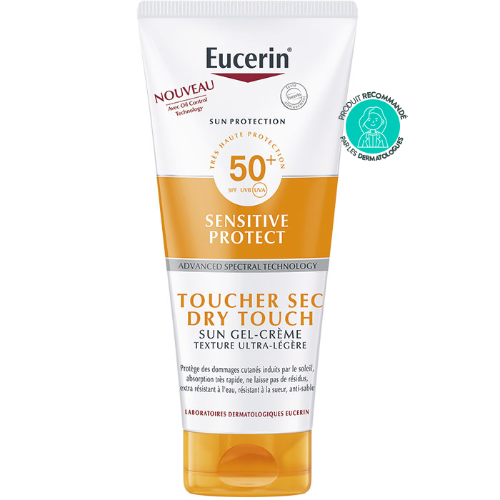 Eucerin Sensitive Protect Sun Gel Crème SPF50+ est un écran solaire haute tolérance offrant une très haute protection UVA/UVB, spécialement formulé pour les peaux sensibles et réactives au soleil, avec un fini sec et mat.
