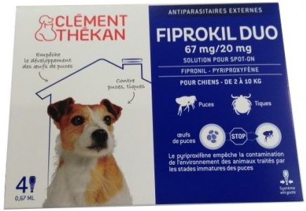 La solution pour spot-on Fiprokil Duo 67 mg/20 mg Chien de Clément Thékan lutte contre les infestations par les puces. Elle est efficace pendant 5 semaines et prévient la prolifération des puces pendant 12 semaines en empêchant le développement de leurs œufs.