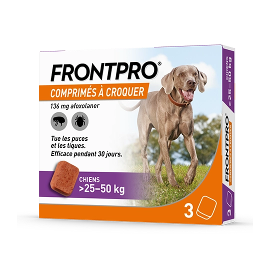 Frontpro est un comprimé appétent et pratique sans ordonnance à donner à votre chien qui offre une protection contre les puces et les tiques. Ce comprimé à croquer peut être administré avec ou sans nourriture.