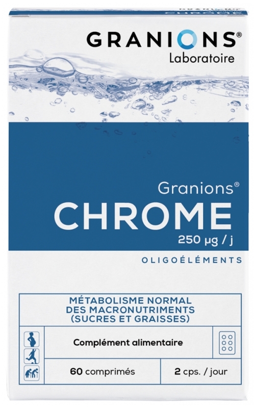 Granions de Chrome 250 µg des Laboratoires des Granions est un complément alimentaire destiné à maintenir le métabolisme normal des macronutriments comme le sucre et les graisses.