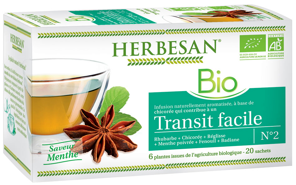 L’Infusion Bio à la saveur Menthe de la marque Herbesan est à base de chicorée, de rhubarbe et d’autres plantes issues de l'agriculture biologique comme la menthe poivrée, le fenouil, et la badiane.