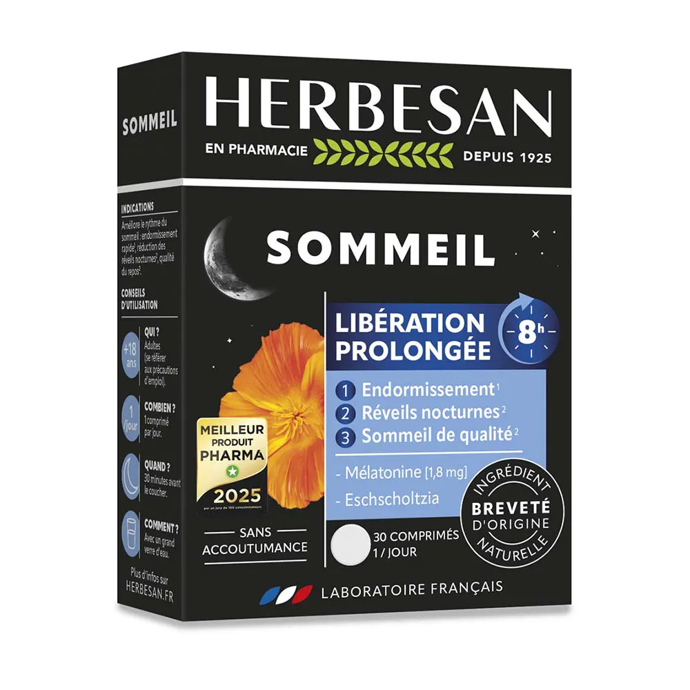 Le complément alimentaire Herbesan Noctaphyt LP 8 h associe de la mélatonine, hormone naturelle impliquée dans la régulation du rythme veille-sommeil, à l’eschscholtzia, plante reconnue pour ses propriétés relaxantes et apaisantes, dans une formulation à libération prolongée sur 8 heures. Cette association est étudiée pour répondre aux besoins des adultes souhaitant réduire le temps d’endormissement, limiter les réveils nocturnes et favoriser un sommeil plus continu et réparateur, sans accoutumance.