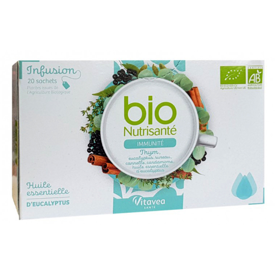 L’Infusion Bio de Nutrisanté est formulée à base de thym et eucalyptus, de Cannelle et de Cardamome, et d'huile essentielle d'eucalyptus.