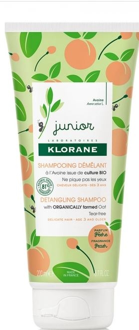 Le Shampooing Démêlant à l'Avoine Bio Junior de la marque Klorane est un shampooing au délicat parfum de pêche doté d’une formule biodégradable. A base de 81% d’ingrédients d’origine naturelle, il nettoie en douceur le cuir chevelu et facilite le démêlage sans piquer les yeux.