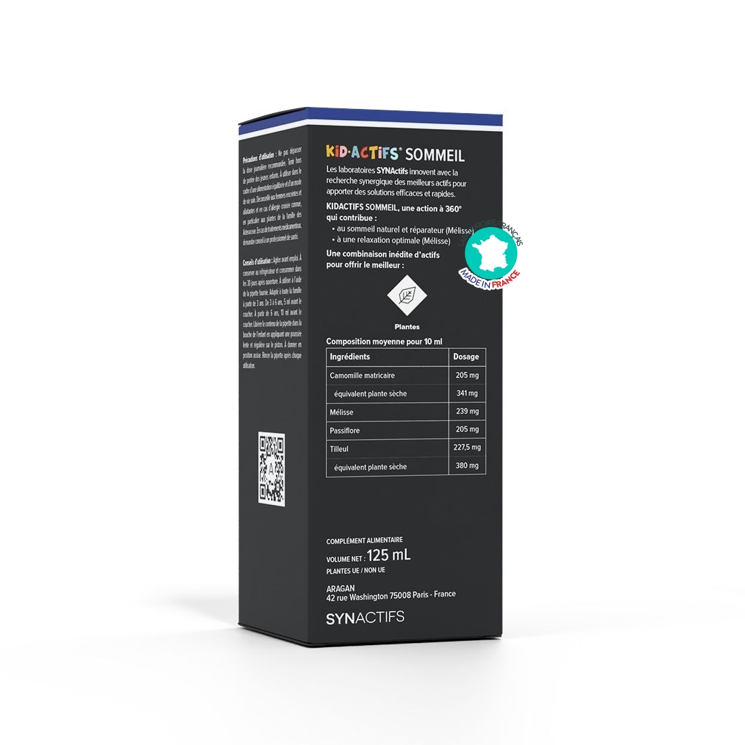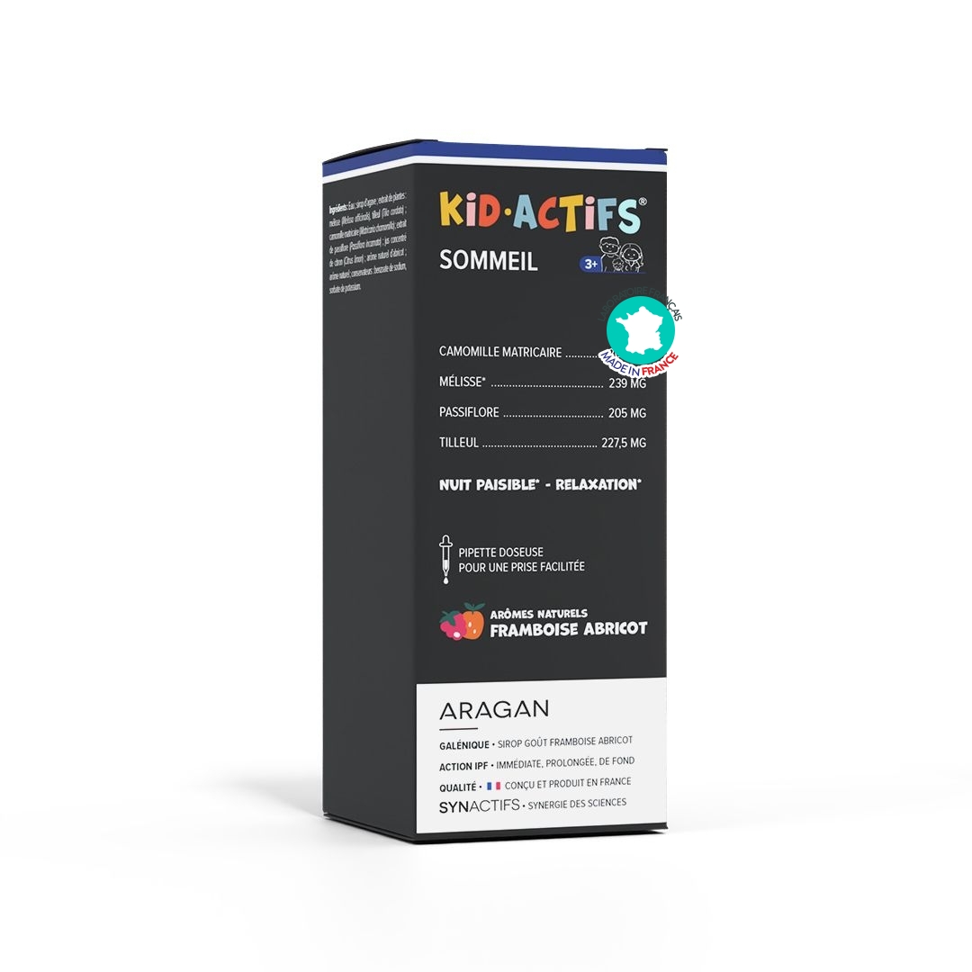 Kid Actifs Sommeil Aragan est un sirop naturel pour le sommeil des enfants dès 3 ans, formulé pour apaiser, faciliter l’endormissement et réduire les réveils nocturnes. Il associe mélisse, passiflore, camomille et tilleul, dans un sirop au bon goût naturel d’abricot et de framboise, sans risque d’accoutumance.