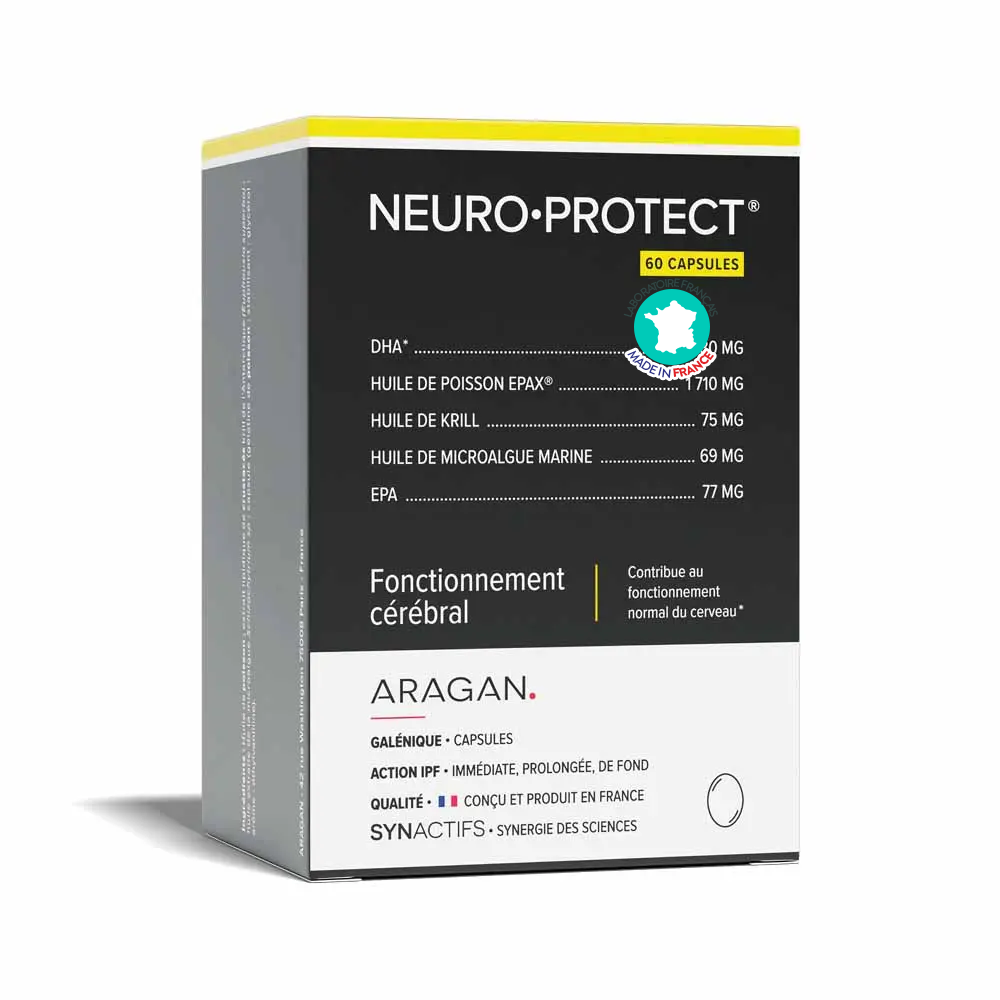 Le cerveau est un organe particulièrement riche en acides gras essentiels, notamment en DHA, indispensable au maintien de ses fonctions normales. Stress, fatigue, âge ou sollicitations intellectuelles intenses peuvent impacter la mémoire et la concentration. Neuro-Protect Aragan a été développé pour apporter un soutien ciblé aux fonctions cérébrales, grâce à une formule concentrée en oméga-3 de haute qualité.