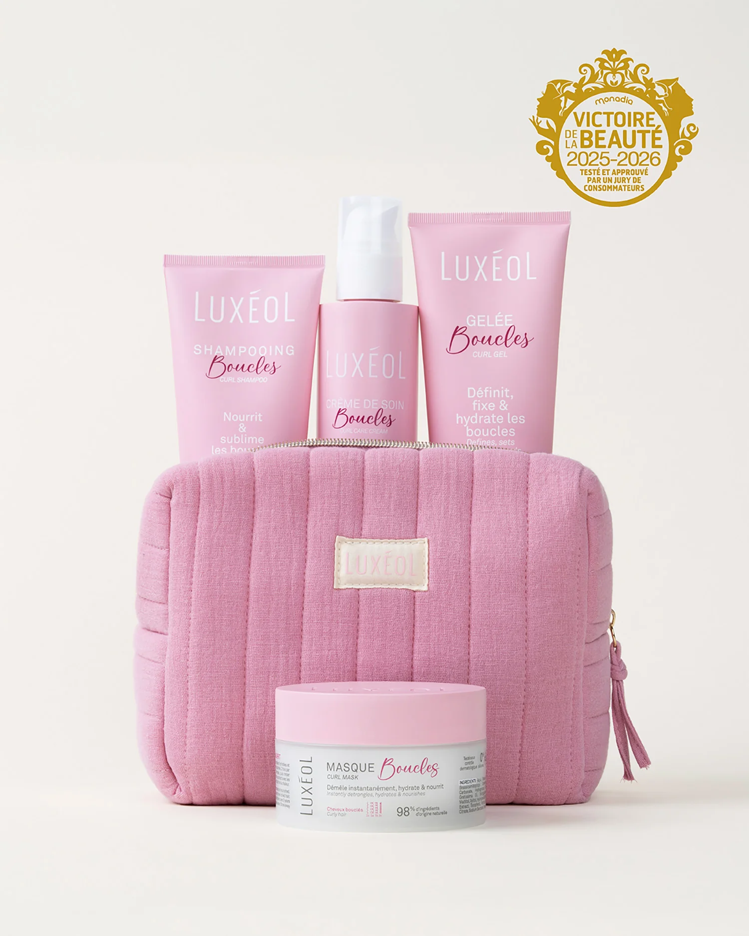 La trousse “La Routine Boucles” de Luxéol rassemble quatre soins complémentaires : un Shampooing Boucles pour nettoyer en douceur, un Masque Boucles pour hydrater et démêler, une Crème de Soin Boucles pour définir et protéger, et une Gelée Boucles pour fixer sans alourdir. Les formules s’appuient sur un extrait d’algue marine + des dérivés de sucre hygroscopiques, pour retenir l’hydratation au cœur de la fibre capillaire et limiter le dessèchement de la boucle.