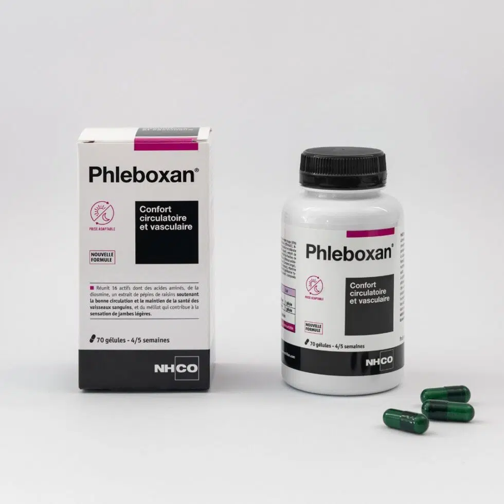 Formulé par NHCO Nutrition, Phleboxan associe les acides aminés spécifiques, vitamines et extraits végétaux ciblés pour soutenir la fonction veineuse :