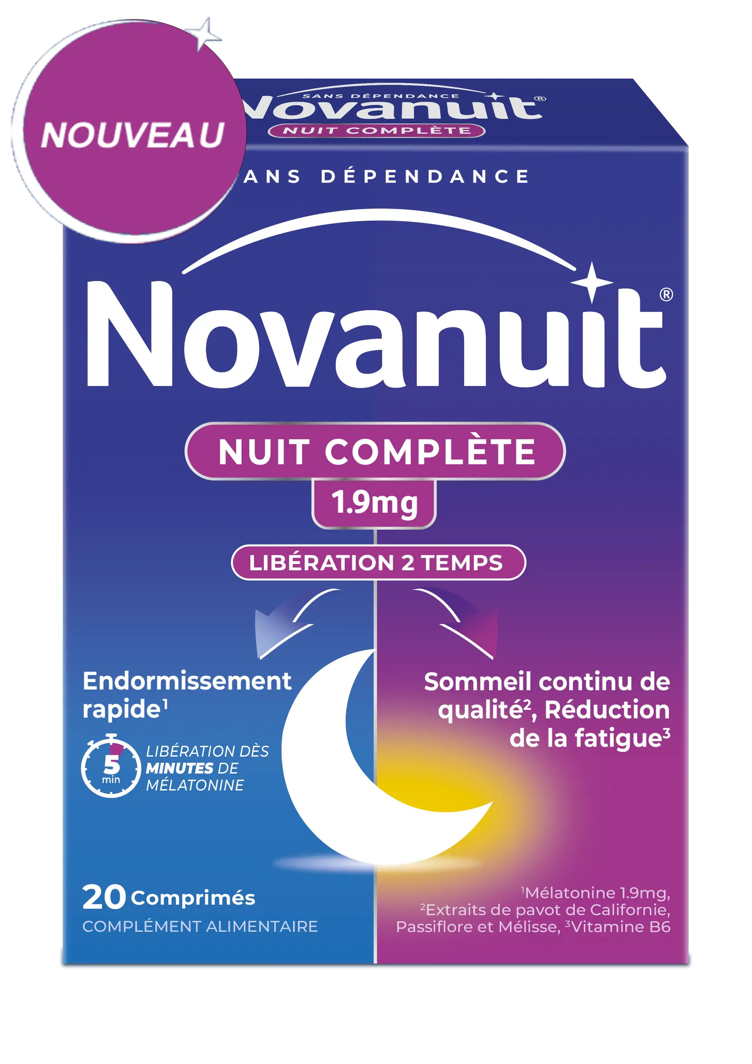 Novanuit® Nuit Complète est un complément alimentaire conçu pour favoriser un endormissement rapide et un sommeil continu de qualité. Sa formule associe 1,9 mg de mélatonine à libération en 2 temps, des plantes relaxantes (mélisse, passiflore, pavot de Californie) et de la vitamine B6, afin de soutenir le cycle naturel du sommeil et réduire la fatigue.