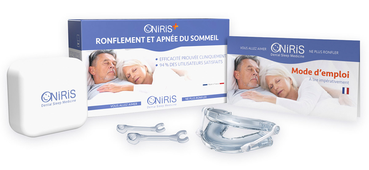 Orthèse d’avancée mandibulaire anti-ronflement, Oniris Plus est un dispositif médical conçu pour maintenir la mâchoire inférieure en position avancée pendant le sommeil afin de faciliter le passage de l’air et réduire les ronflements.