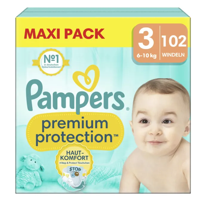 Informations sur Pampers Premium Protection couches taille 3 6-10 kg cœur absorbant anti-fuites — pack de 102 couches