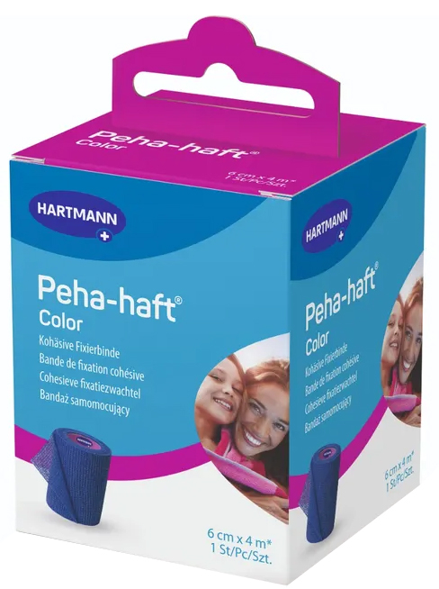 La Bande de Fixation Cohésive Bleue Peha-Haft de Hartmann permet de supporter les pansements au niveau des parties coniques et arrondies du corps ou sur les articulations.