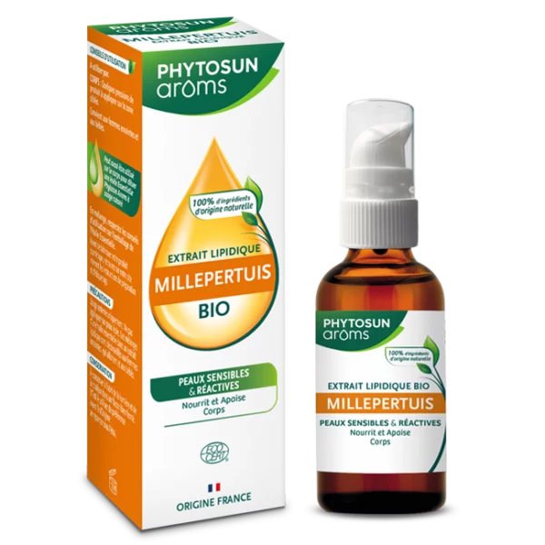 L’extrait lipidique de millepertuis Bio Phytosun Arôms 50 ml est une huile végétale cosmétique certifiée bio riche en principes hydratants et apaisants naturels, obtenue par macération des sommités fleuries de Hypericum perforatum dans une huile support douce. Elle est particulièrement adaptée aux peaux sensibles, réactives ou irritées, car elle aide à restaurer le confort cutané, à renforcer la barrière hydrolipidique et à redonner souplesse et douceur à l’épiderme du visage et du corps.