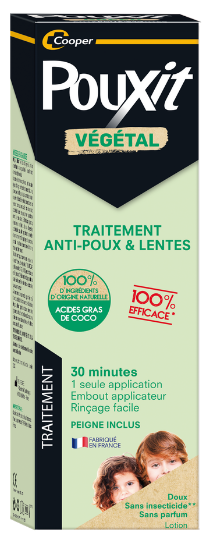 Le Traitement Anti-poux & Lentes Pouxit Végétal de la marque Cooper élimine les poux et les lentes dans les cheveux par effet physique.