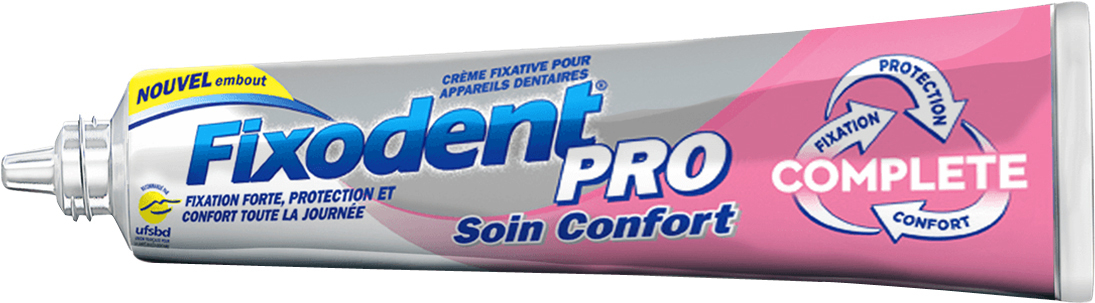 Pour une meilleure fixation et le confort de vos prothèses dentaires, utilisez FIXODENT Pro Soin Confort.