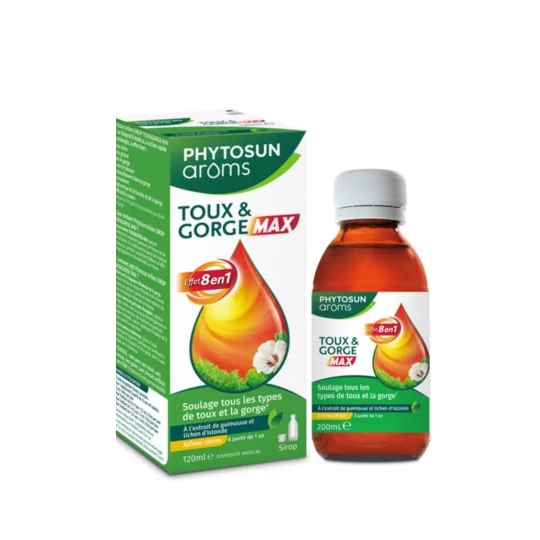 Phytosun Arôms SIROP TOUX & GORGE MAX est un dispositif médical effet 8-en-1, à action rapide et prolongée qui soulage tous les types de toux associées à un rhume et la gorge.