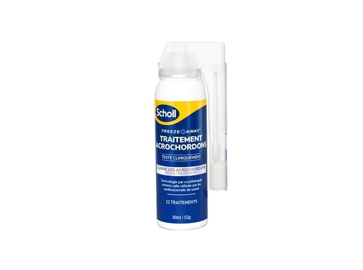 Le traitement Freeze Away Acrochordons de Scholl est un dispositif de cryothérapie à usage domestique, cliniquement testé, conçu pour éliminer efficacement et en toute sécurité les acrochordons — ces petites excroissances cutanées bénignes, de couleur chair ou légèrement plus foncées, composées de fibres de collagène lâches et de petits vaisseaux sanguins entourés de peau. Bien qu'indolores dans la majorité des cas, les acrochordons peuvent s'irriter sous l'effet du frottement des vêtements ou des bijoux, provoquant un inconfort voire de petits saignements. Le traitement Freeze Away utilise une technologie de congélation ciblée appliquée grâce à un applicateur de précision, permettant de traiter chaque excroissance individuellement en seulement 40 secondes. La peau traitée blanchit et forme une cloque indolore, signe de l'action efficace de la cryothérapie. L'acrochordon tombe généralement en moins de deux semaines, laissant la peau lisse et sans cicatrice. Chaque boîte contient 1 aérosol de 80 ml et 12 applicateurs pour traiter jusqu'à 12 acrochordons à domicile. Ce dispositif est réservé aux adultes dès 18 ans et ne doit être utilisé que sur des acrochordons bénins clairement identifiés.