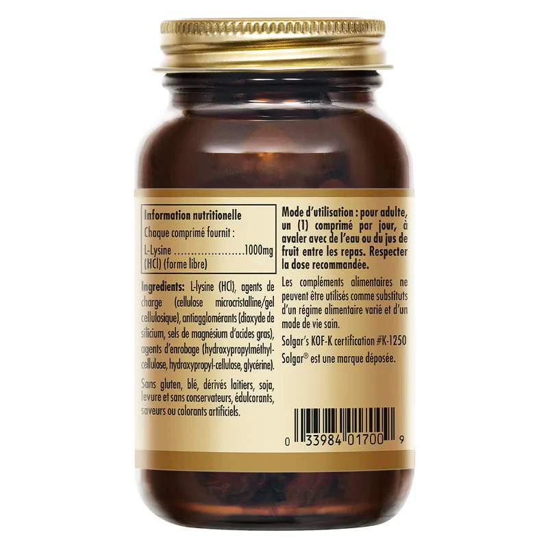 Informations sur Solgar L-Lysine 1000 mg 50 comprimés acide aminé essentiel soutien immunitaire