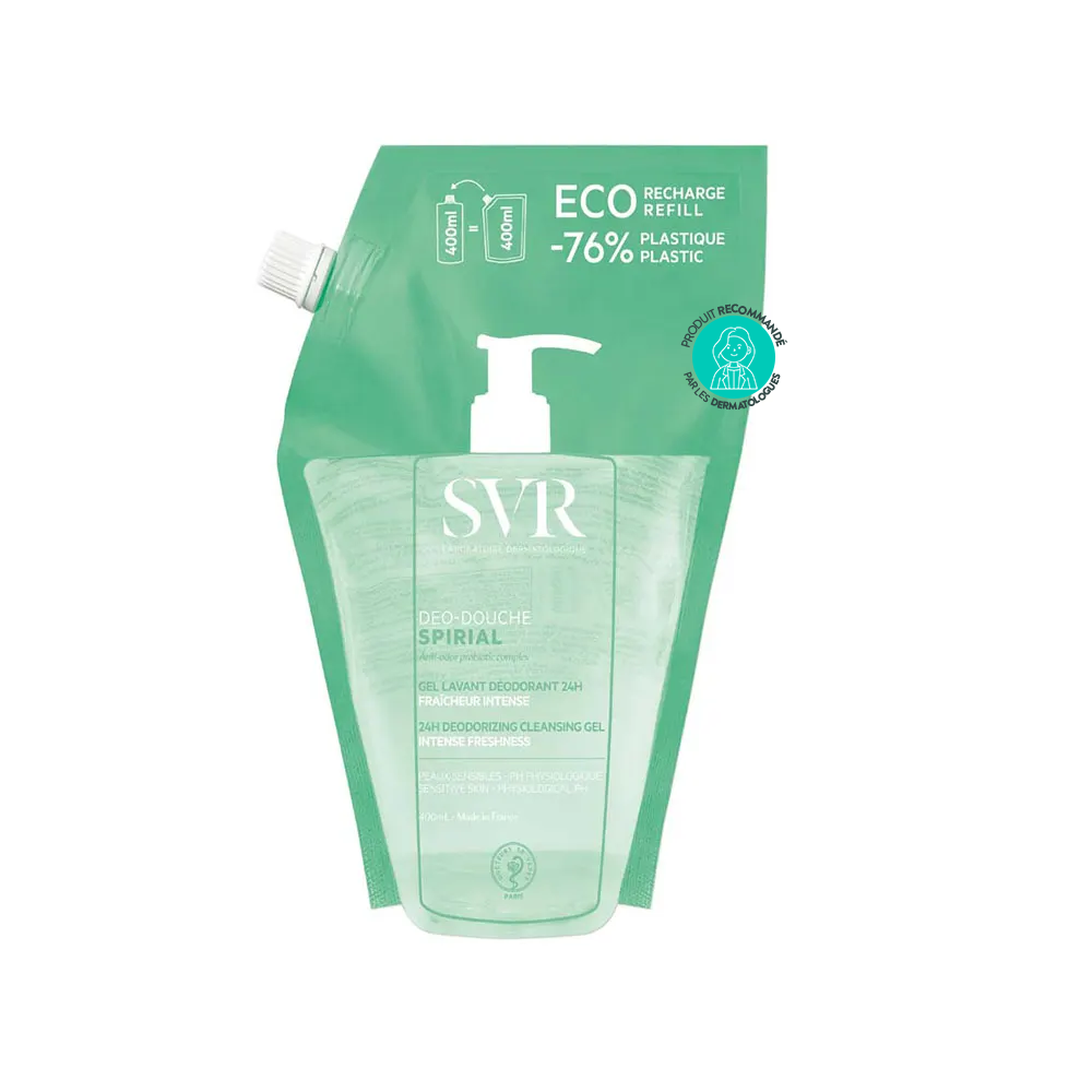 Utiliser SVR Spirial Déo Douche recharge gel lavant déodorant 24h 400 ml – Hygiène anti-odeurs & fraîcheur longue durée