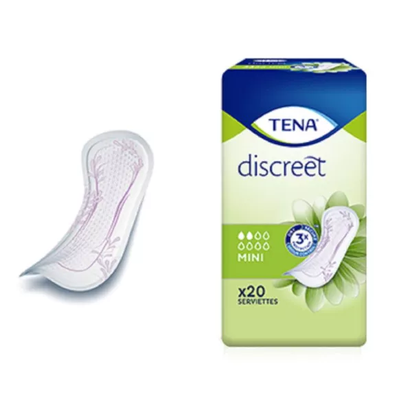 Tena Discreet Mini serviette anatomique incontinence légère femme — boîte de 20 technologie MicroPROTEX avis