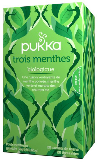 Le The Biologique Trois Menthe de Pukka est une infusion composée de menthe poivrée, de menthe verte et de menthe des champs d’origine biologique.